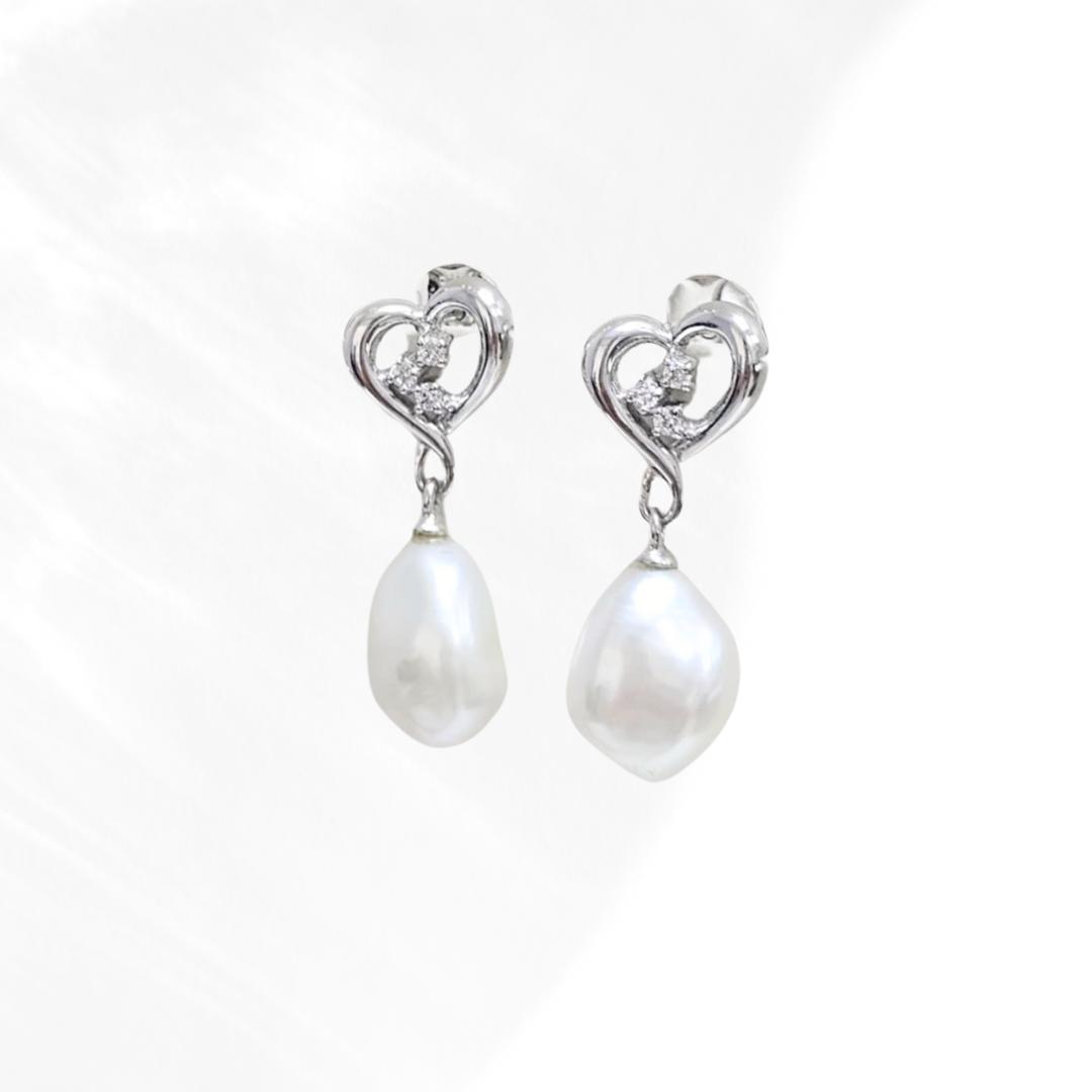 WHITE FRESHWATER BAROQ MINI HEART DANGLING EARRING WITH CZ